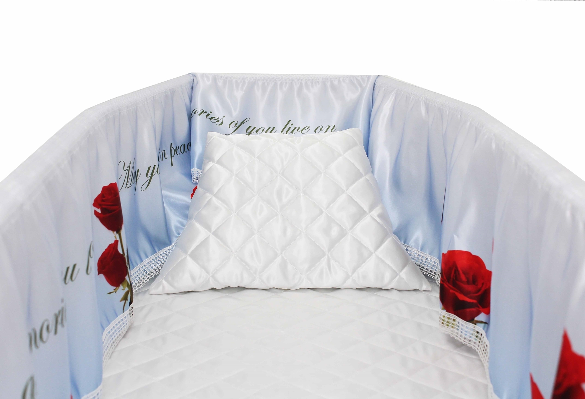Luxury satin interior printed using water-based ink. The printed interior set consists of a 18-inch 2 Way printed satin frill, printed satin facecloth, quilted satin pillow and a quilted satin mattress.The chosen design will be printed on the interior. Image is to illustrate style of Interior Only.