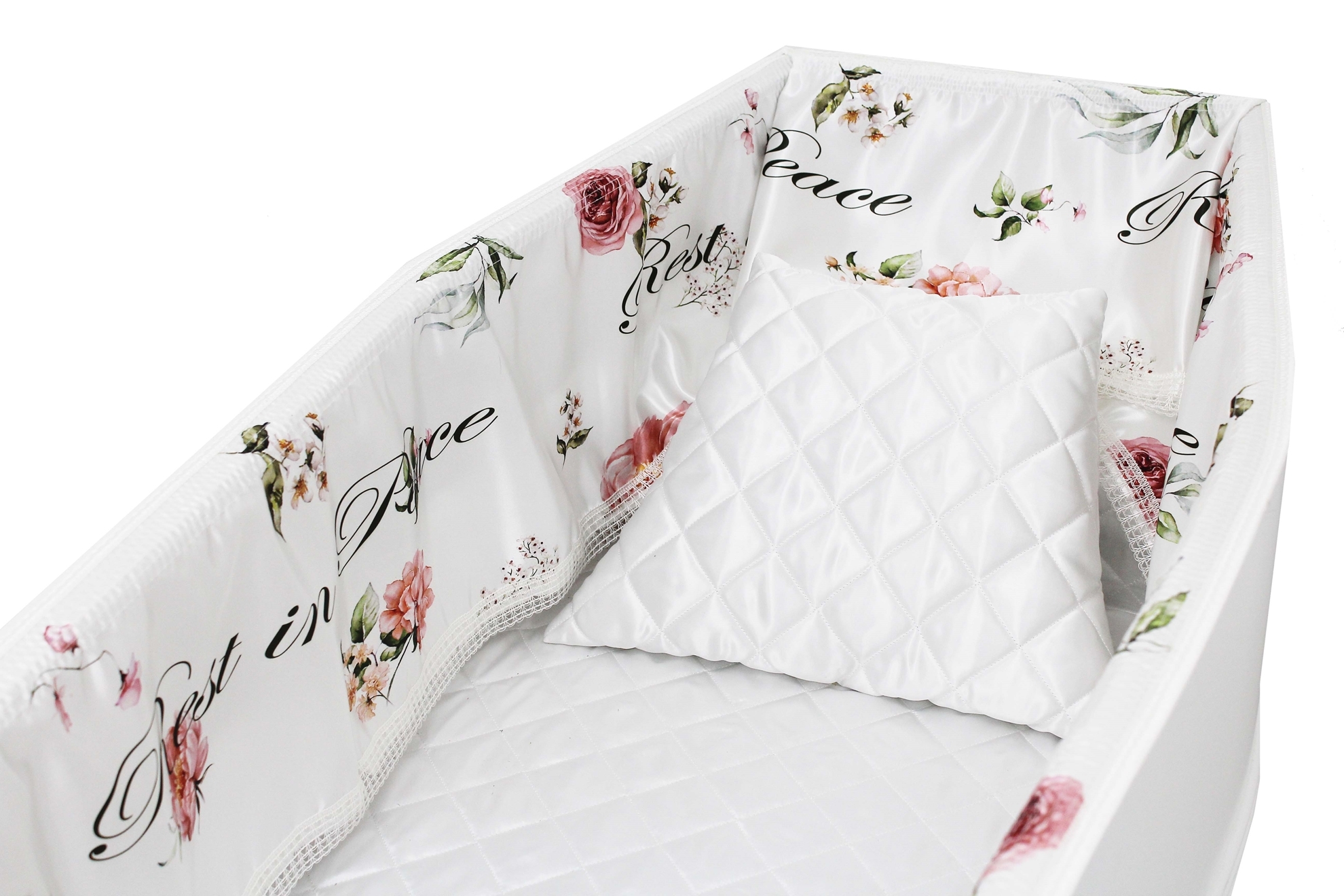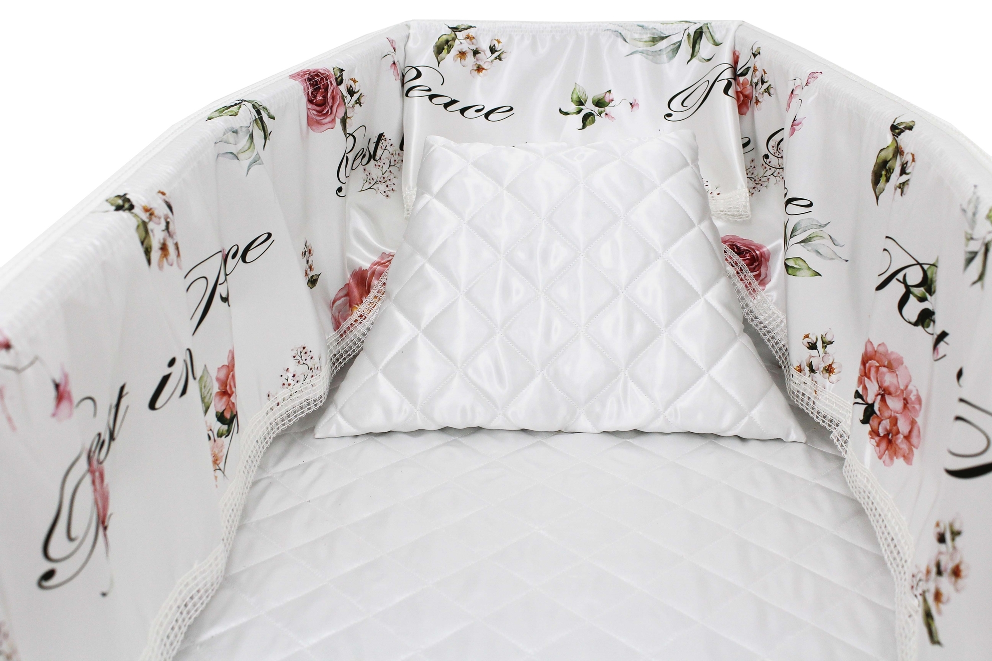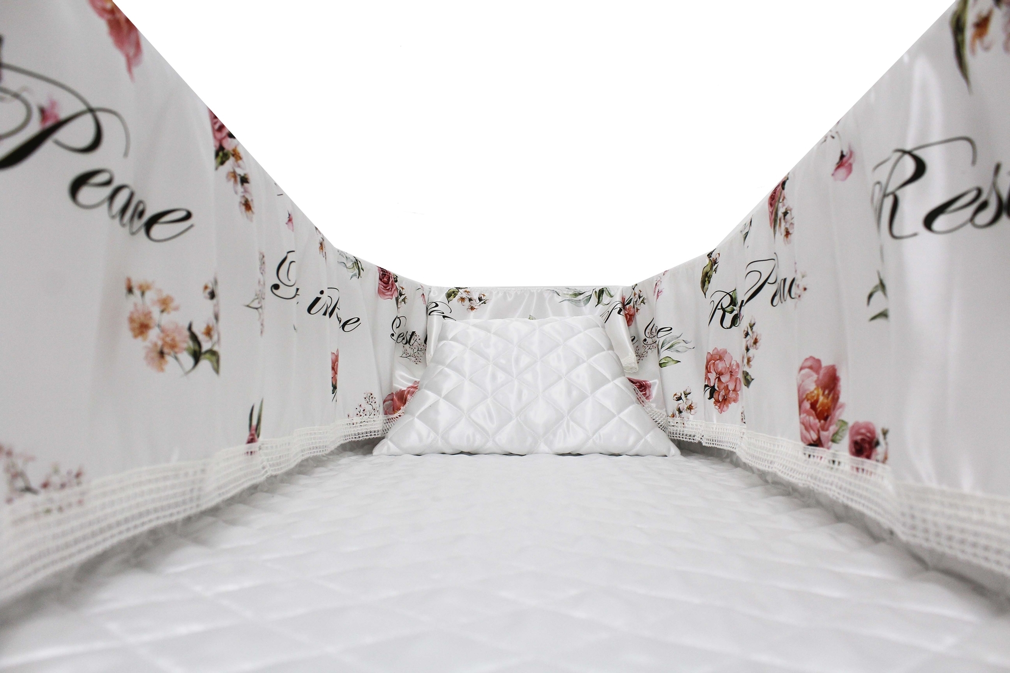 Luxury satin interior printed using water-based ink. The printed interior set consists of a 12-inch printed satin frill, printed satin facecloth, quilted satin pillow and a quilted satin mattress.