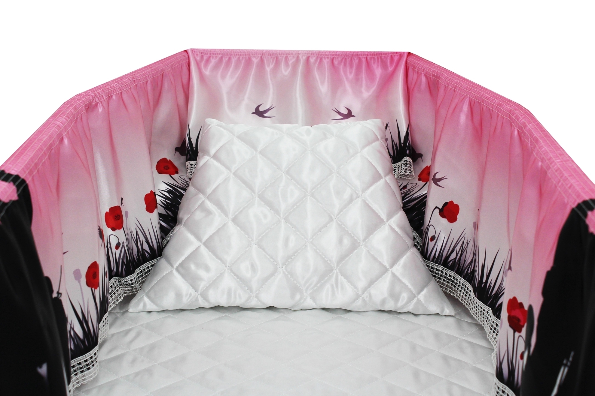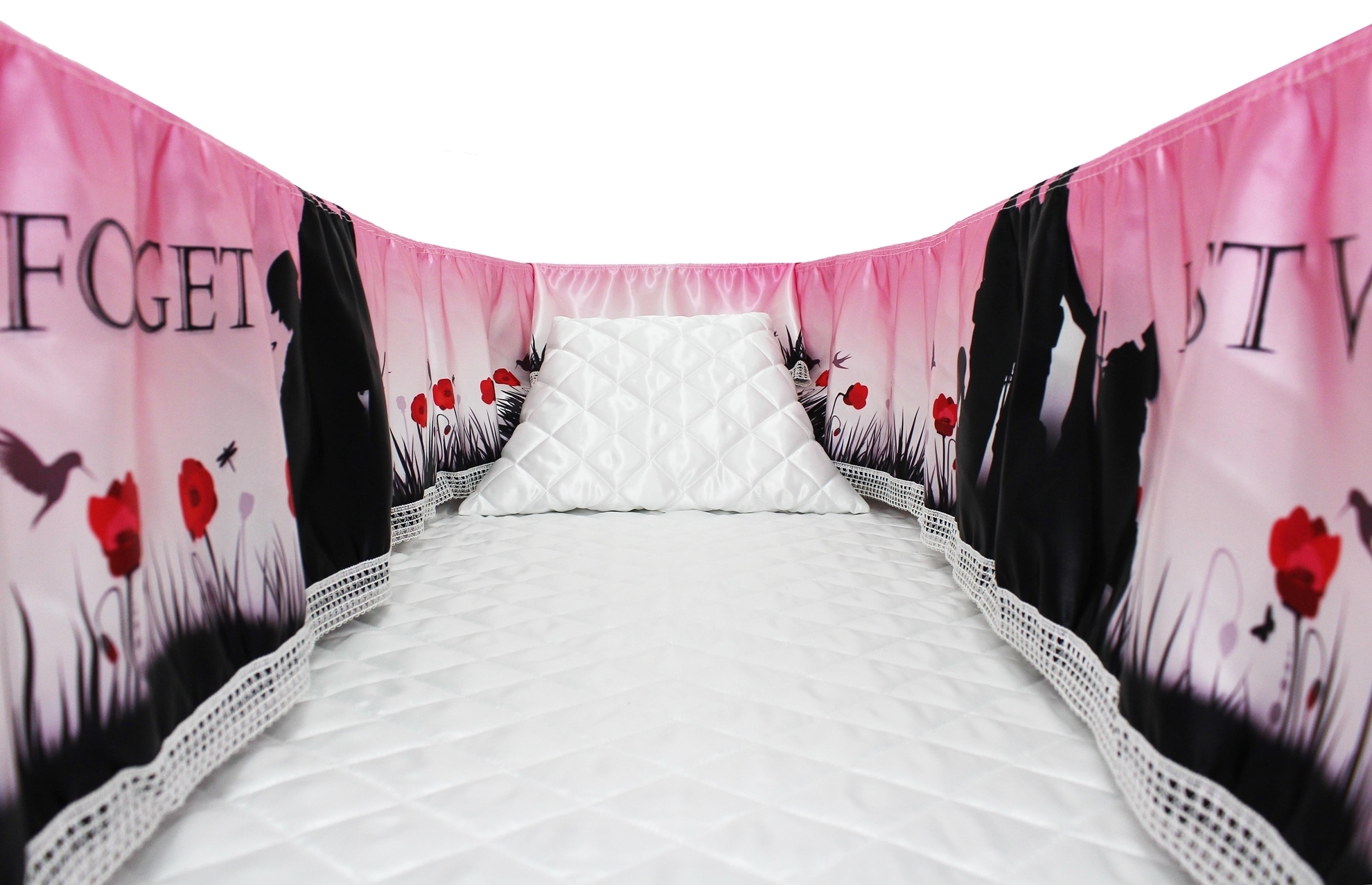 Luxury satin interior printed using water-based ink. The printed interior set consists of a 12-inch printed satin frill, printed satin facecloth, quilted satin pillow and a quilted satin mattress.