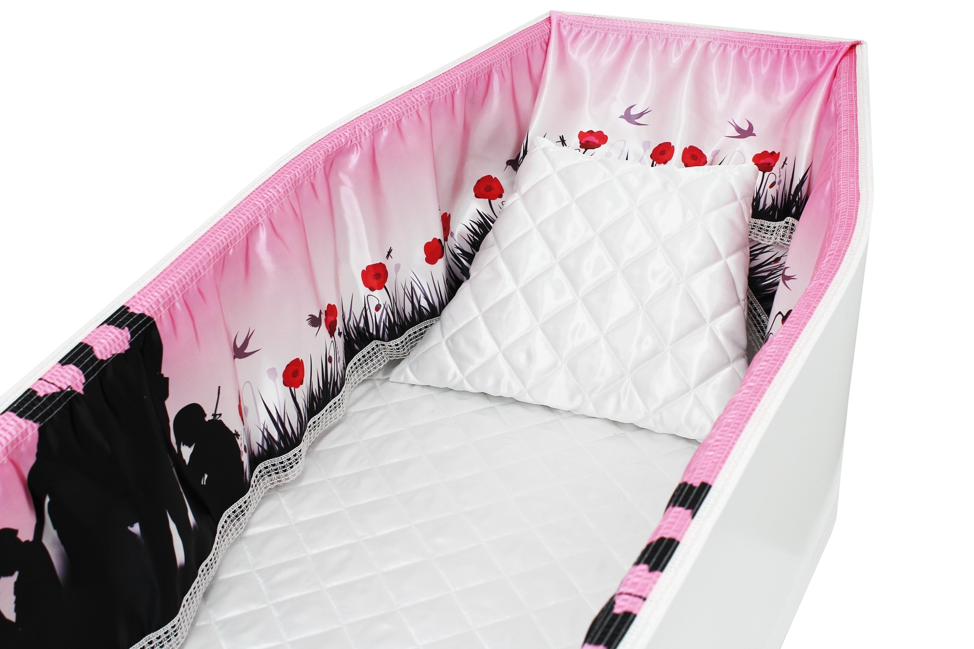 Luxury satin interior printed using water-based ink. The printed interior set consists of a 18-inch 2 Way printed satin frill, printed satin facecloth, quilted satin pillow and a quilted satin mattress.The chosen design will be printed on the interior. Image is to illustrate style of Interior Only.