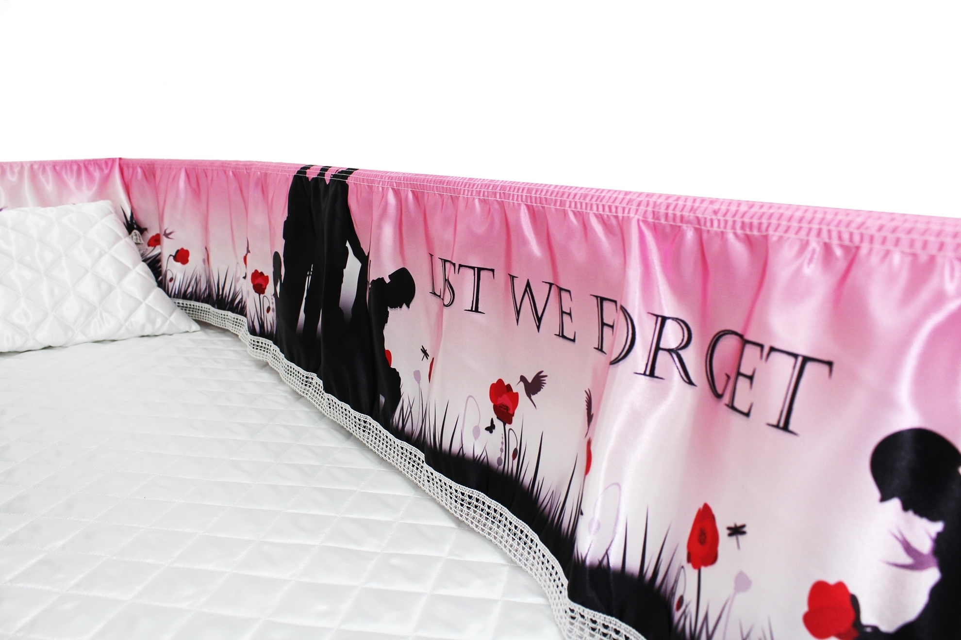 Luxury Satin 18-inch 2-way frill consisting of a 12-inch internal frill with an additional 6-inch exterior frill. The chosen design will be printed on the 18" 2-Way Frill. Please note the image shows a mattress and a pillow which are NOT included. Image is to illustrate style of Interior Only.