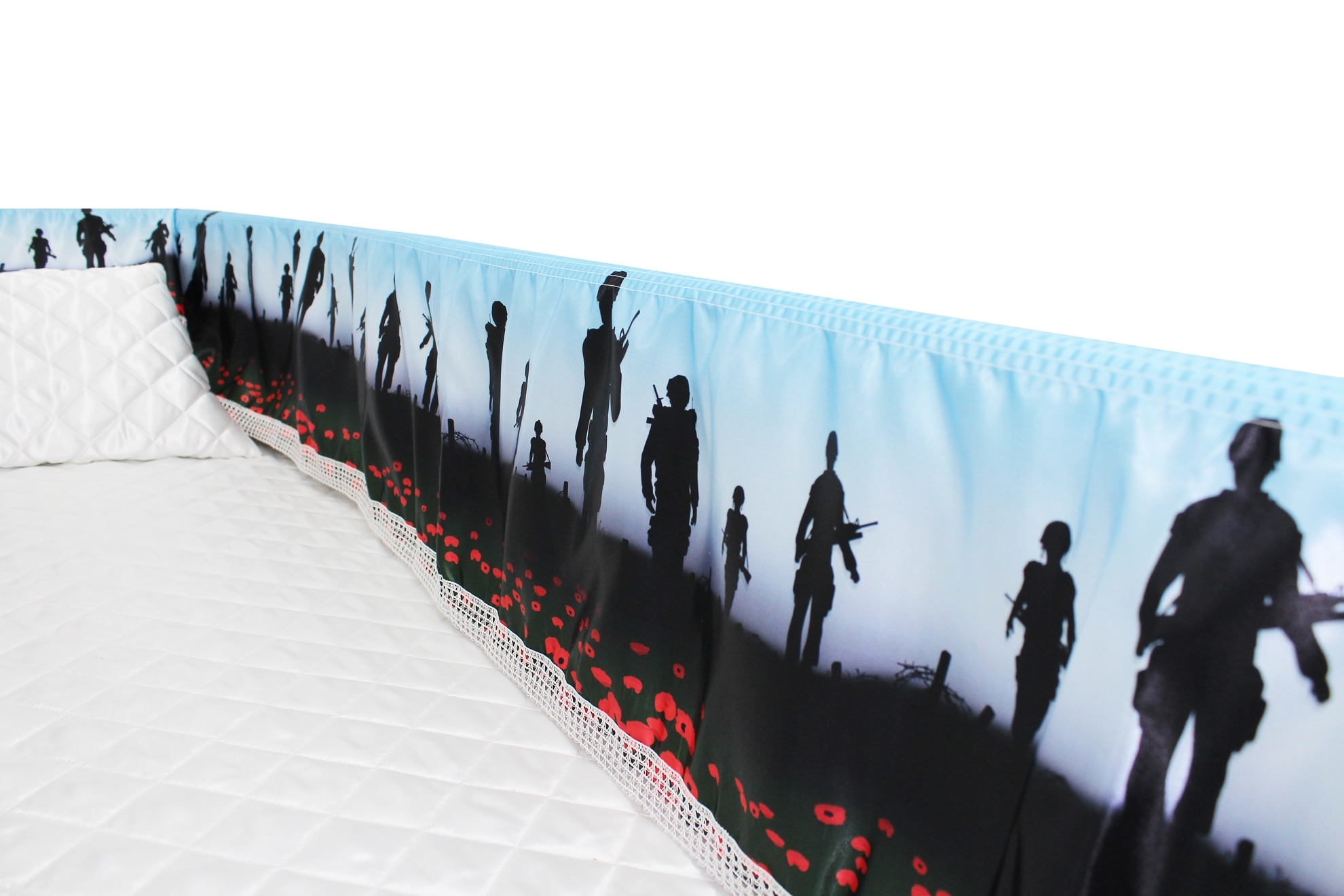 Luxury Satin 18-inch 2-way frill consisting of a 12-inch internal frill with an additional 6-inch exterior frill. The chosen design will be printed on the 18" 2-Way Frill. Please note the image shows a mattress and a pillow which are NOT included. Image is to illustrate style of Interior Only.