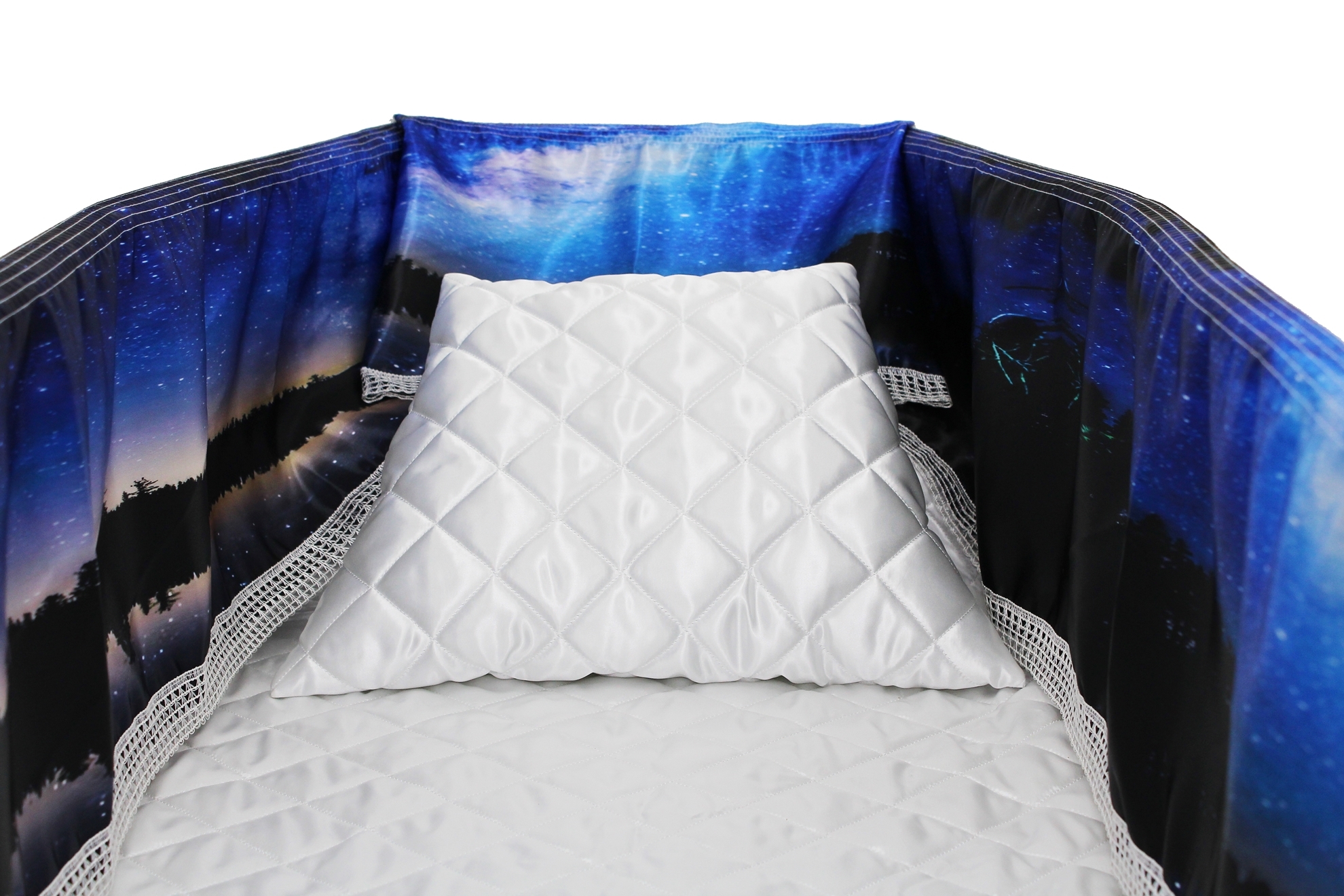 Luxury satin interior printed using water-based ink. The printed interior set consists of a 18-inch 2 Way printed satin frill, printed satin facecloth, quilted satin pillow and a quilted satin mattress.The chosen design will be printed on the interior. Image is to illustrate style of Interior Only.