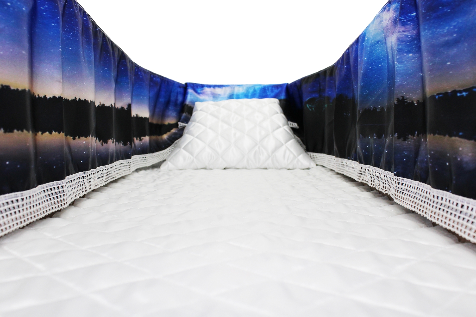 Luxury Satin 18-inch 2-way frill consisting of a 12-inch internal frill with an additional 6-inch exterior frill. The chosen design will be printed on the 18" 2-Way Frill. Please note the image shows a mattress and a pillow which are NOT included. Image is to illustrate style of Interior Only.