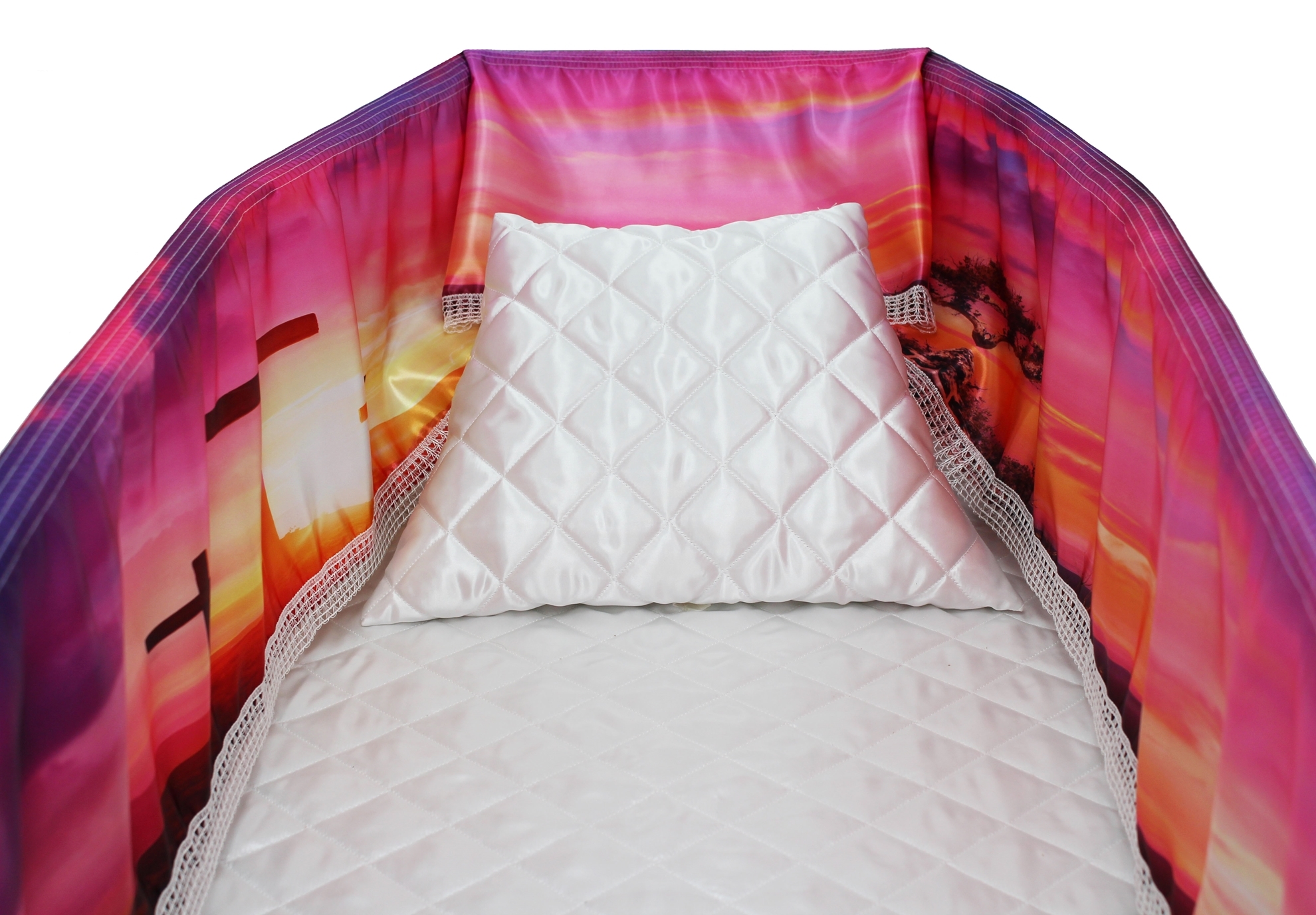 Luxury satin interior printed using water-based ink. The printed interior set consists of a 12-inch printed satin frill, printed satin facecloth, quilted satin pillow and a quilted satin mattress.