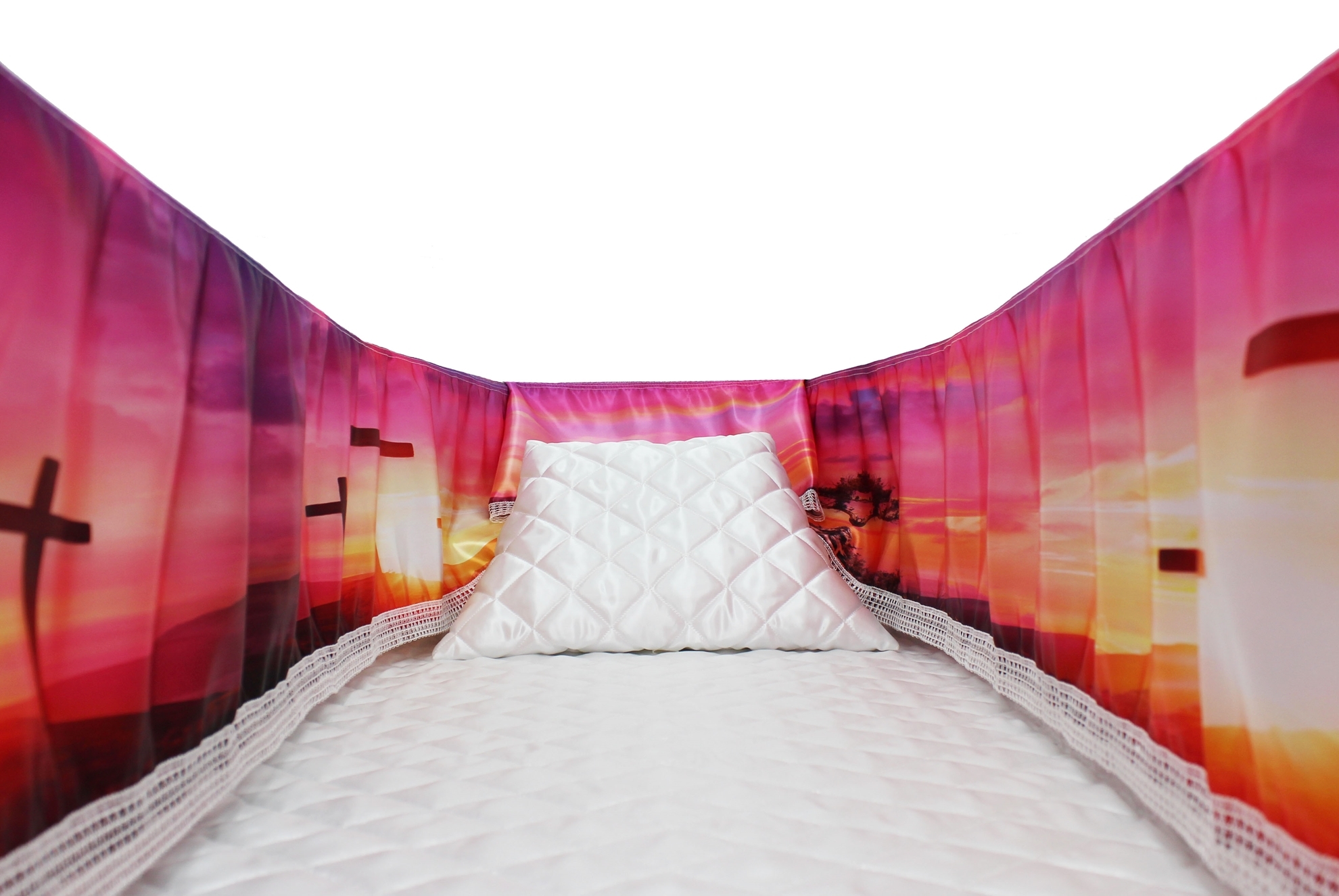 A cost effective satin elasticated all in one coffin suite. Making it quick and simple to fit. The chosen design will be printed on the Anna.