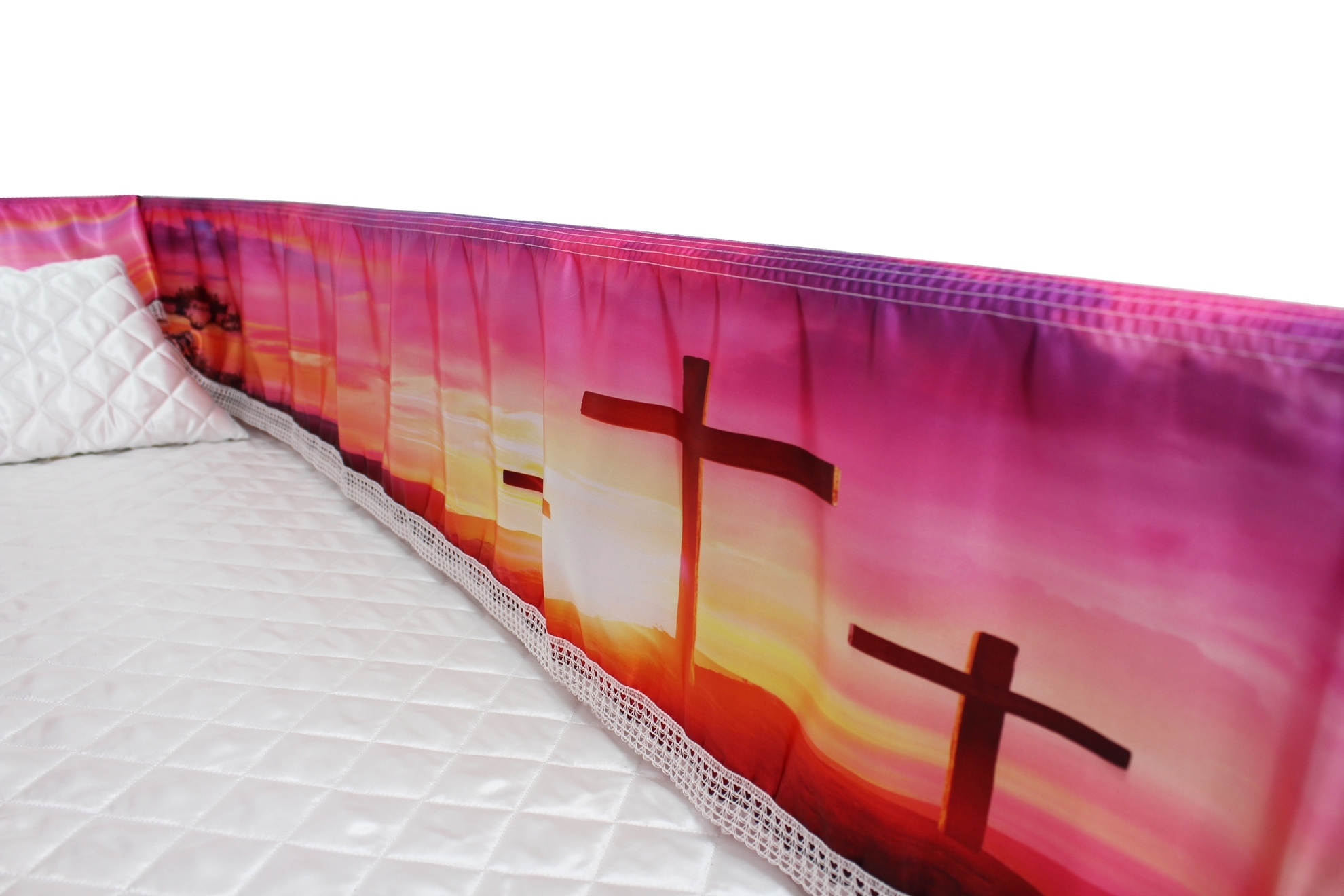 12-inch Printed Satin frill to be attached to the lip of the coffin/casket. Please note the image shows a mattress and pillow which are NOT included.