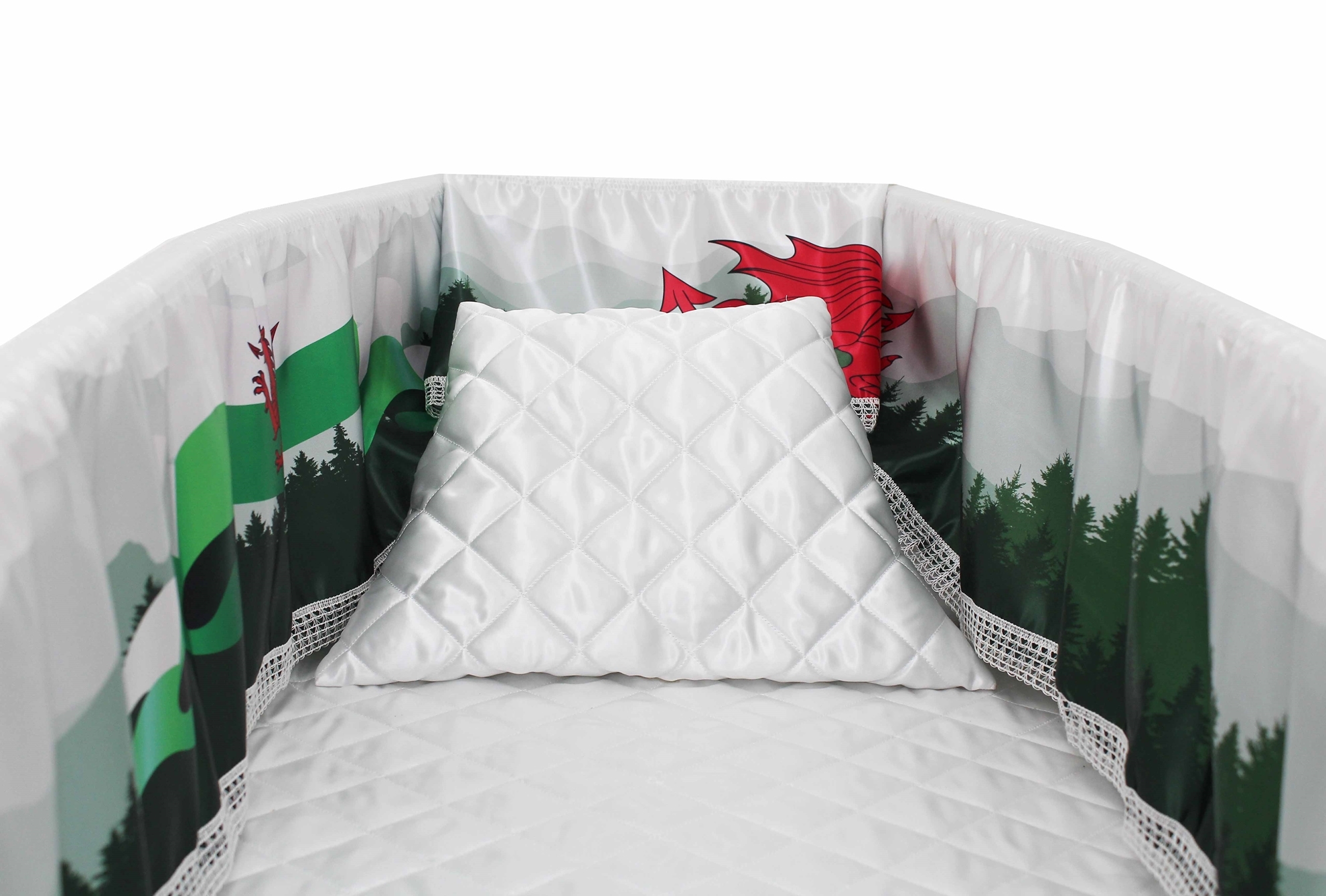 Luxury Satin 18-inch 2-way frill consisting of a 12-inch internal frill with an additional 6-inch exterior frill. The chosen design will be printed on the 18" 2-Way Frill. Please note the image shows a mattress and a pillow which are NOT included. Image is to illustrate style of Interior Only.